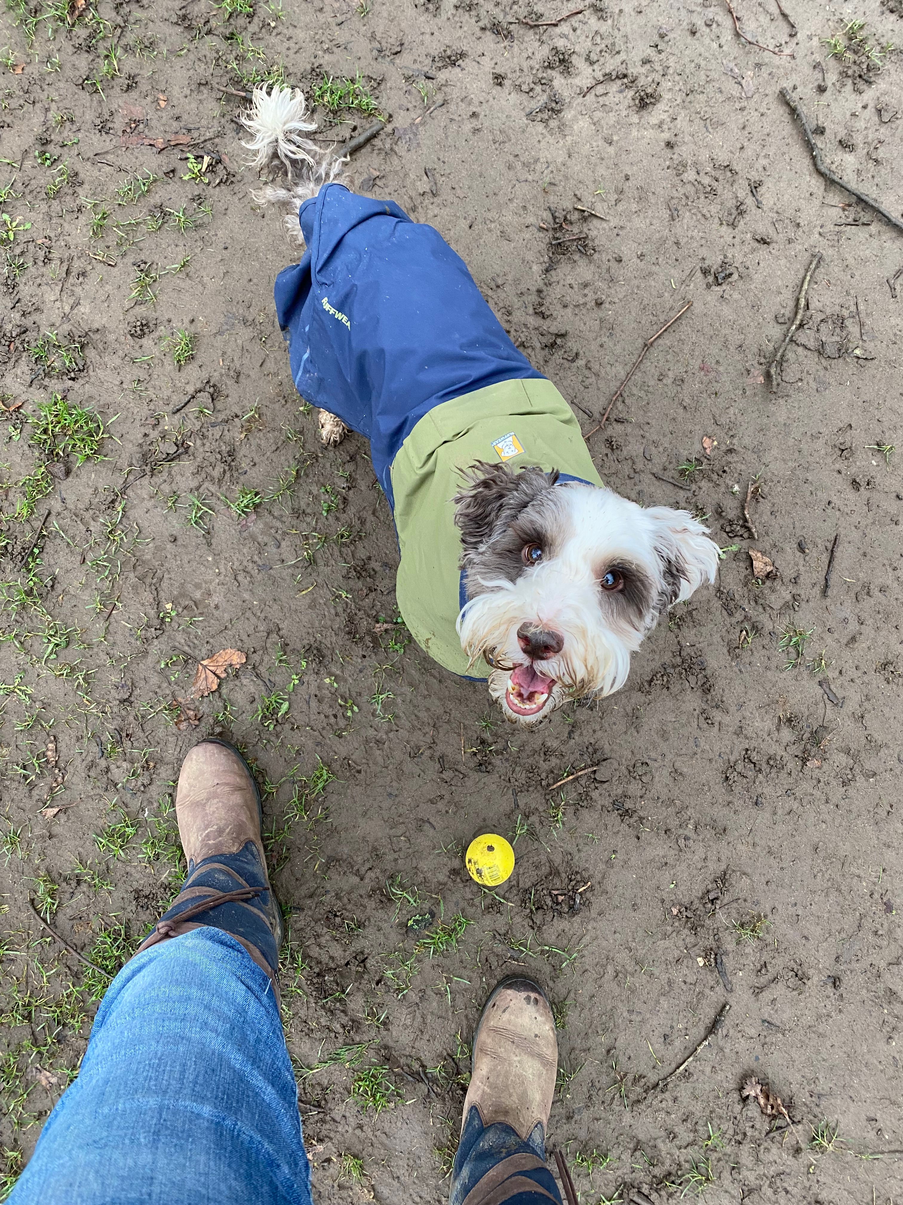 The fold-up storm collar and TailGate™ offer extended coverage over the neck, rump, and thighs to keep dogs dry in wet conditions.